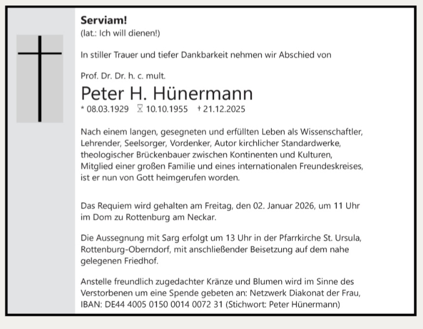 En lugar de coronas y flores, se solicita, en conformidad con los deseos del difunto, una donación a: Netzwerk Diakonate der Frauen (Red Diaconal de Mujeres), IBAN: DE44 4005 0150 0014 0072 31 (Referencia: Peter Hünermann)